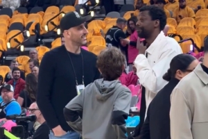 体育资讯4月20日讯 今日西部季后赛首轮马刺对阵开拓者,赛前有记者拍到文班亚马父亲和马刺名宿吉诺比利在场边热聊。